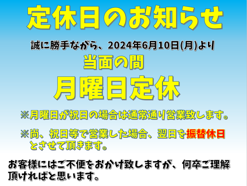 月曜定休の振替実施のお知らせ
