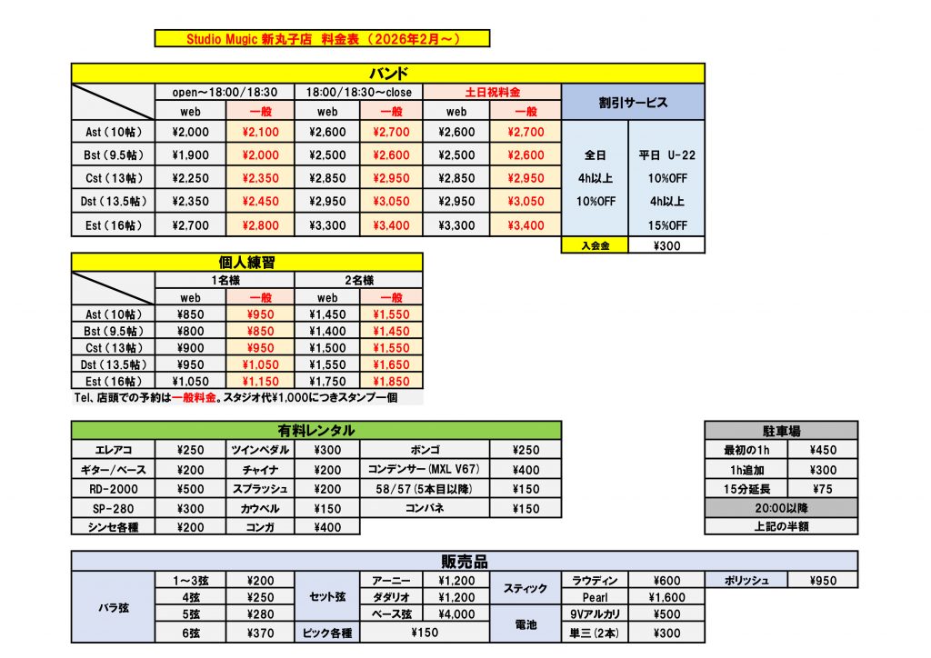 2025年11月29日 【2026年2月~ 平日 料金改定実施のお知らせ】 いつもMUGIC 新丸子をご利用頂き誠にありがとうございます。 この度、経済的な変化や物価の上昇に伴い 2026年2月1日(日)~「平日18:00~CLOSEのバンド練習料金」の改定を実施させて頂く運びとなりました。※土日祝料金との統一 詳しい金額については上記の新料金表をご参照ください。 お客様にはご負担をおかけしますが、引き続きご満足いただける品質とサービスの提供にスタッフ一同努めてまいりますので、何卒ご理解賜りますようお願い申し上げます。